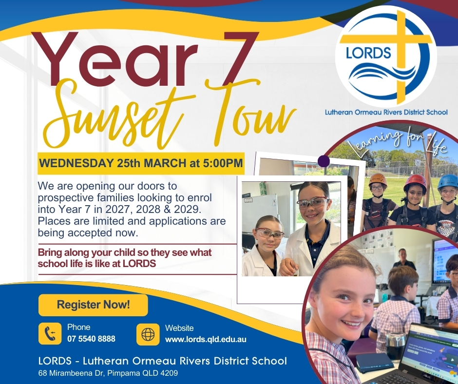 LORDS will hold its annual Year 7 Sunset Tour on Wednesday 25th March from 5:00pm to 6:00pm. We also hold numerous tours in both Terms 1 and Term 2 (conducted by our Principal and transition teams), and we would like families to be as informed as possible about our school and what we can offer for every student. We encourage families to attend private school tours to see how LORDS operates on a normal school day. We also encourage families to bring along their children so they can see what school life is like at LORDS.